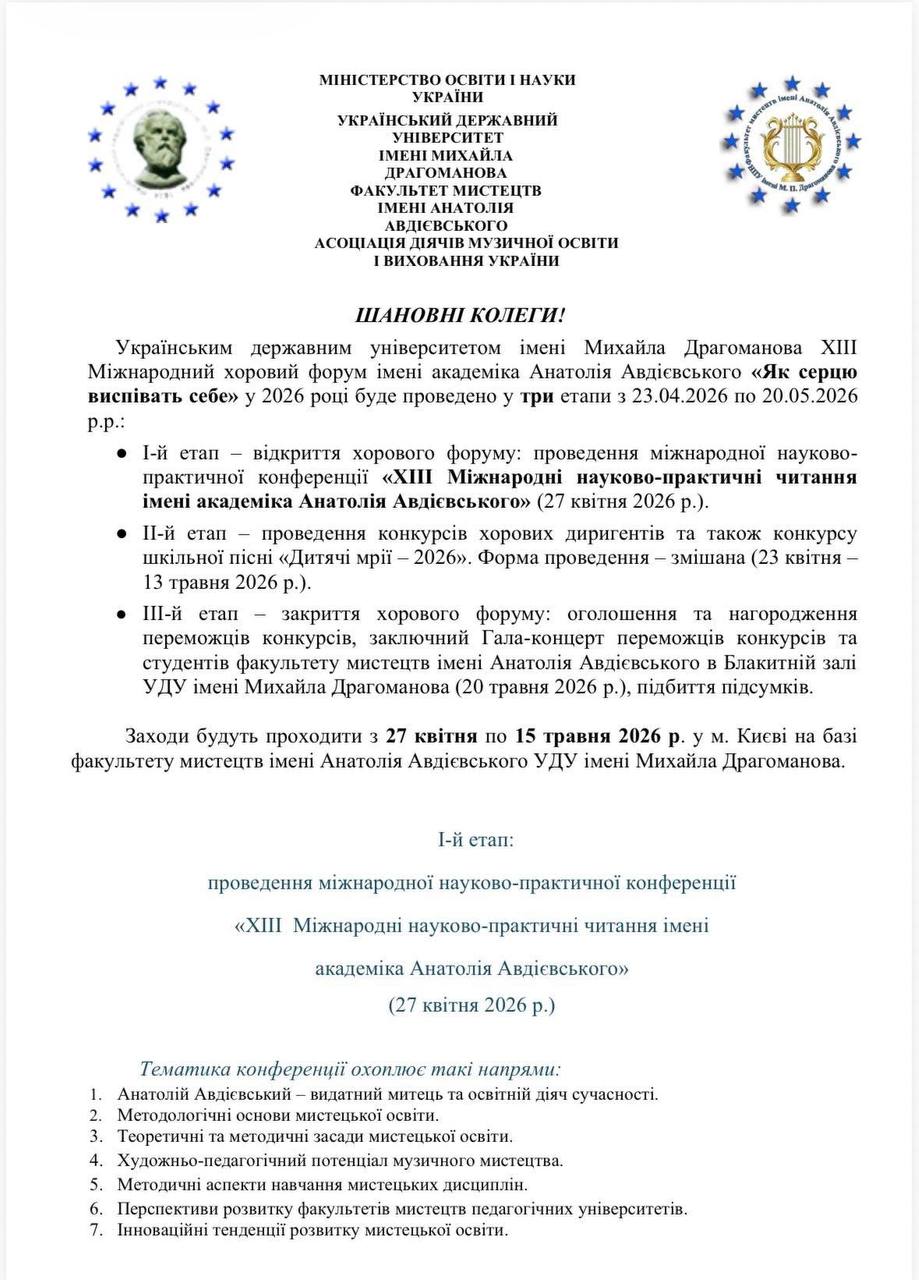 Факультет мистецтв імені Анатолія Авдієвського Українського державного університету імені Михайла Драгоманова запрошує до участі у XIII Міжнародному хоровому форумі «Як серцю виспівать себе», присвяченому пам’яті академіка Анатолія Авдієвського!
