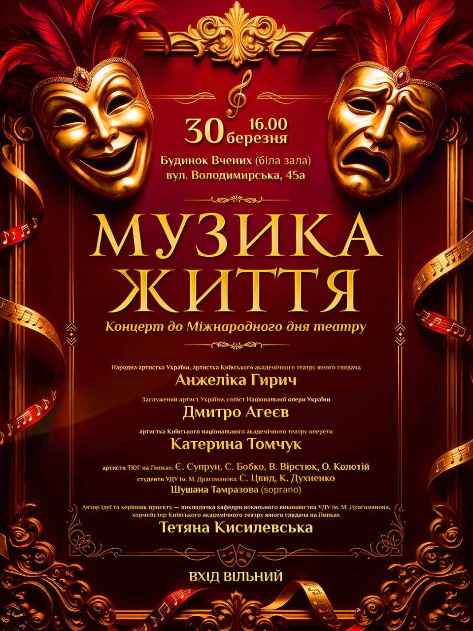 До Міжнародного дня актора в Будинку Вчених відбувся концерт «Музика життя» — яскрава мистецька подія, що об’єднала сцену, музику та театральне мистецтво