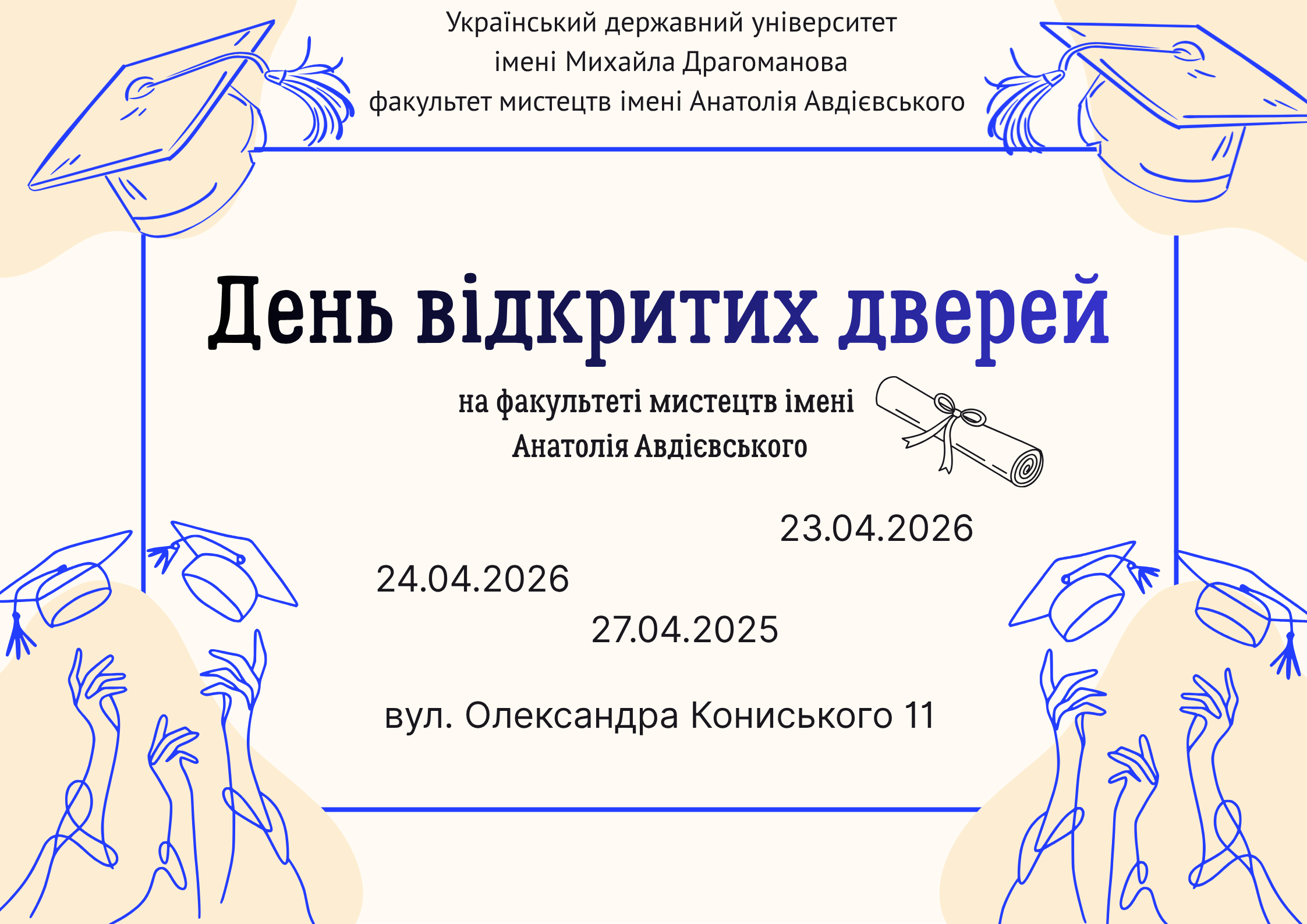 На факультеті мистецтв імені Анатолія Авдієвського відбудеться День відкритих дверей. Запрошуємо майбутніх абітурієнтів, їхніх батьків та всіх зацікавлених у здобутті мистецької освіти взяти участь в цих заходах.